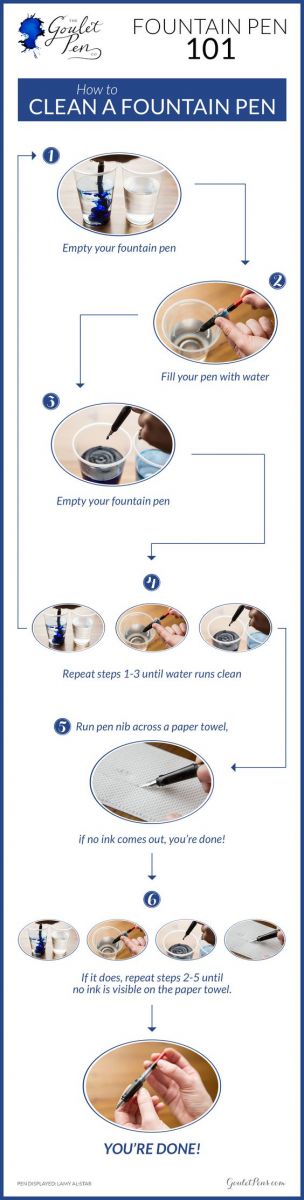 Pulpen Fountain pen adalah sebuah pulpen yang memiliki ujung mata pulpen yang tajam dan berbentuk seperti panah dilengkapi dengan kantung tinta yang dapat diisi ulang. Tinta yang dipakai adalah tinta berbasis air, diisi melalui mata pulpen dengan mekanisme memakai penyedot tinta yang kemudian dimasukkan ke dalam kantung tinta di dalam pulpen. Dibandingkan dengan jenis pulpen yang lain, pulpen fountain pen membutuhkan perlakuan yang lebih halus. Tidak seperti pulpen yang lainnya, saat Anda ingin mengisi kembali tinta fountain pen ada baiknya jika Anda membersihkan dahulu pulpen Anda dari sisa-sisa tinta sebelumnya. Dalam artikel ini, kami akan menjelaskan bagaimana caranya membersihkan fountain pen Anda.