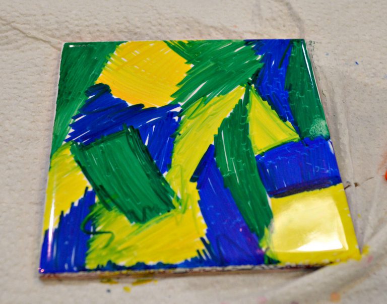 Spidol Sharpie, alkohol 90%, 4.25 x 4.25 inch keramik, kuas kecil, acrylic coating.